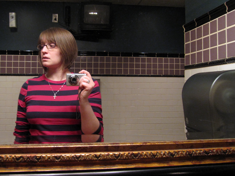 PHOTOS: Plant and two sign photos taken with Jen’s mobile. Portraits taken with Tim’s iPhone. Bathroom shot by my Canon Powershot. All photos by me except the final photo of me wearing solid red.