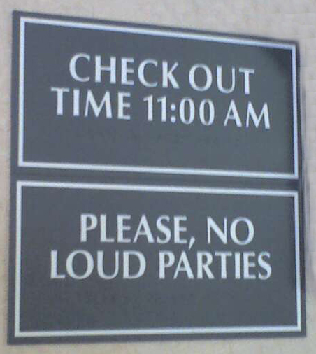 We only had about another hour until we reached our hotel. Upon arriving, I was tickled to see this sign. Surely, such a proclamation would ensure that our brief stay would be quiet and peaceful. Clearly, the fools forgot to hang the sign reading, “And furthermore, NO UNATTENDED CHILDREN.”